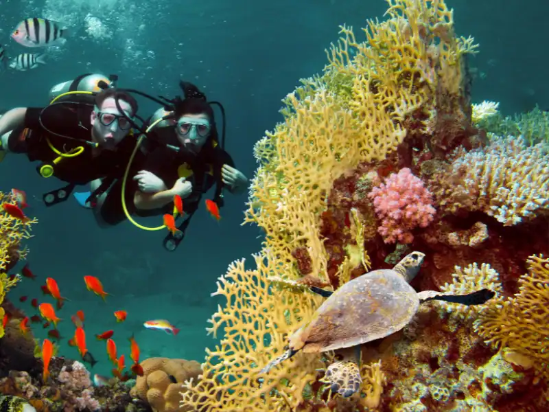 Les lagons maldiviens offrent un terrain de jeu exceptionnel pour les amoureux de la mer. Le snorkeling à deux permet d’explorer des récifs préservés et d’observer poissons multicolores, tortues ou raies dans des eaux d’une clarté saisissante. Pour les plus curieux, la plongée sous-marine révèle des paysages marins spectaculaires, tandis que les sorties en mer offrent parfois la chance d’apercevoir dauphins ou requins-baleines.