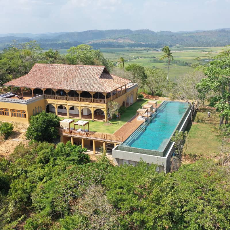 Loin du littoral, les routes s’élèvent doucement vers les collines parfumées d’Ahangama. Votre prochaine adresse vous ouvre ses portes : un hôtel-boutique raffiné, caché au cœur des plantations de thé, offrant une vue apaisante sur les vallées verdoyantes.