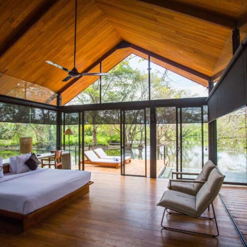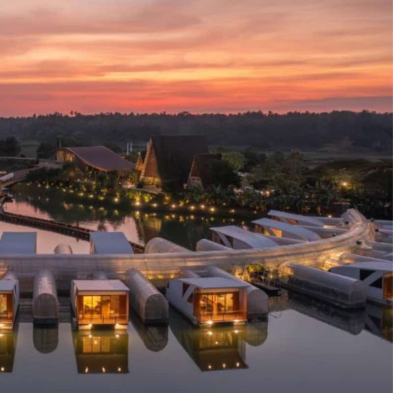 Là, un refuge flottant d’exception vous attend, posé entre ciel et eau, entre nénuphars et oiseaux migrateurs. Chaque détail y invite à la détente : bois précieux, hamacs au-dessus de l’eau, silence feutré.